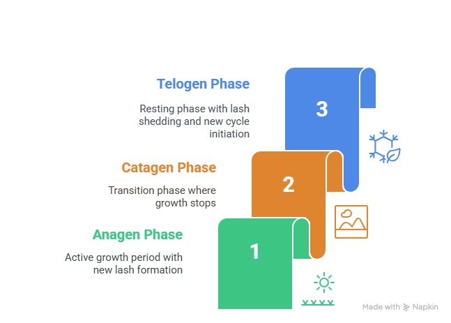 Eyelash growth follows a natural cycle consisting of anagen (growth), catagen (transition), and telogen (rest) phases. Tears contain water, salts, and enzymes but lack nutrients necessary to nourish or stimulate lash follicles. Therefore, tears do not influence the eyelash growth cycle.