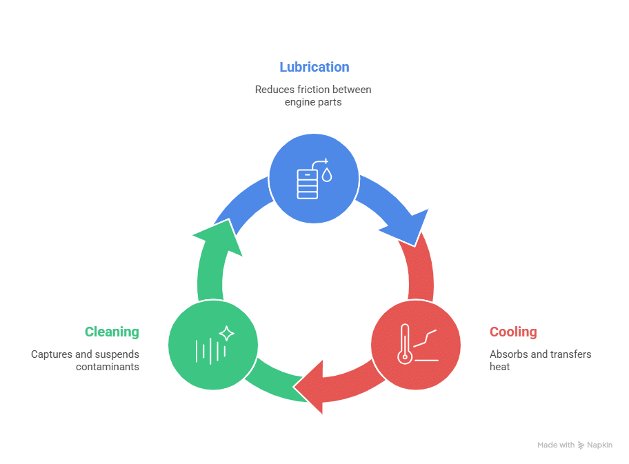 - Cleaning: Engine oil captures dirt, metal particles, and combustion byproducts, suspending these contaminants until your next oil change.